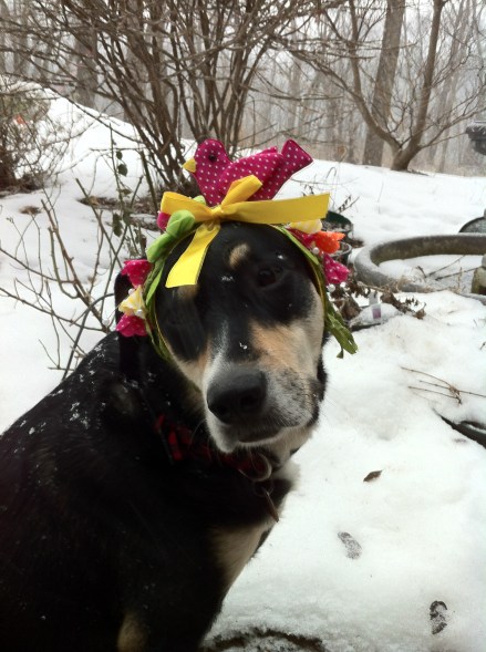 Sarah seems confused today. The headband says spring, but the snow is a pretty definitive statement that it is still winter. Posted by choppythedog