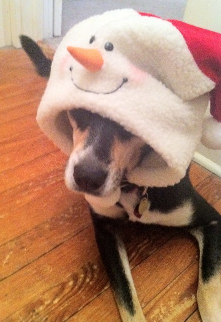 We have no snow here. That has not stopped Sarah from making me wear a snowman hat. Posted by choppythedog